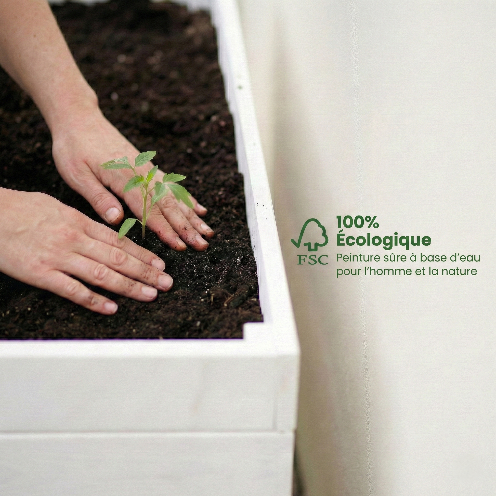 - 100 % sûr et durable : Votre potager mérite de rester sain. C’est pourquoi nous utilisons une peinture à l’eau respectueuse de l’environnement afin d’éviter toute contamination de votre terreau par des produits chimiques nocifs. De plus, le bois est certifié FSC à 100 %, garantissant ainsi une gestion durable des forêts.