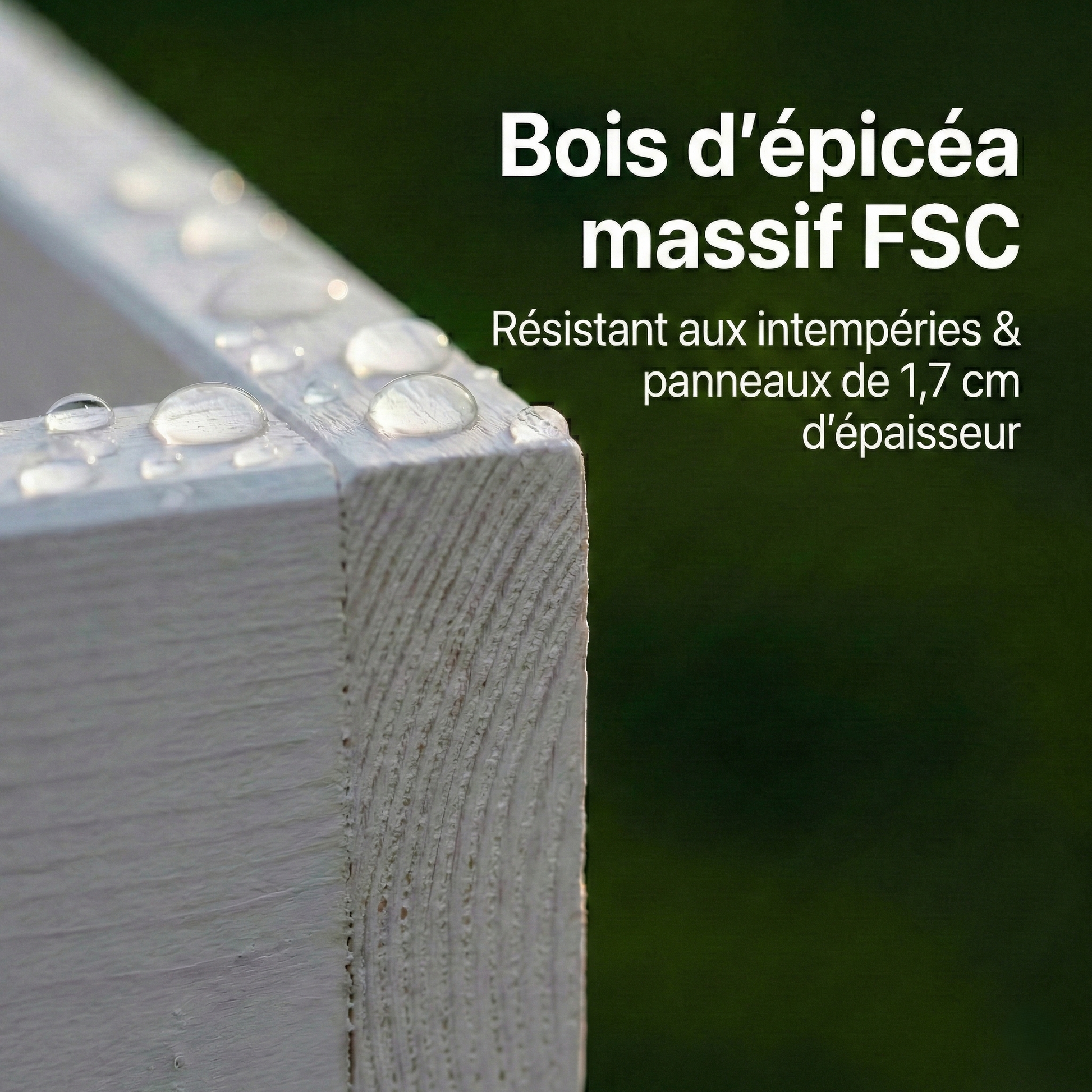 - Extrêmement robuste et résistante aux intempéries : conçue pour durer plusieurs saisons. Fabriquée en épicéa massif avec des panneaux latéraux extra-épais. La boîte est recouverte d’une peinture blanche à base d’eau de haute qualité qui protège le bois des intempéries.