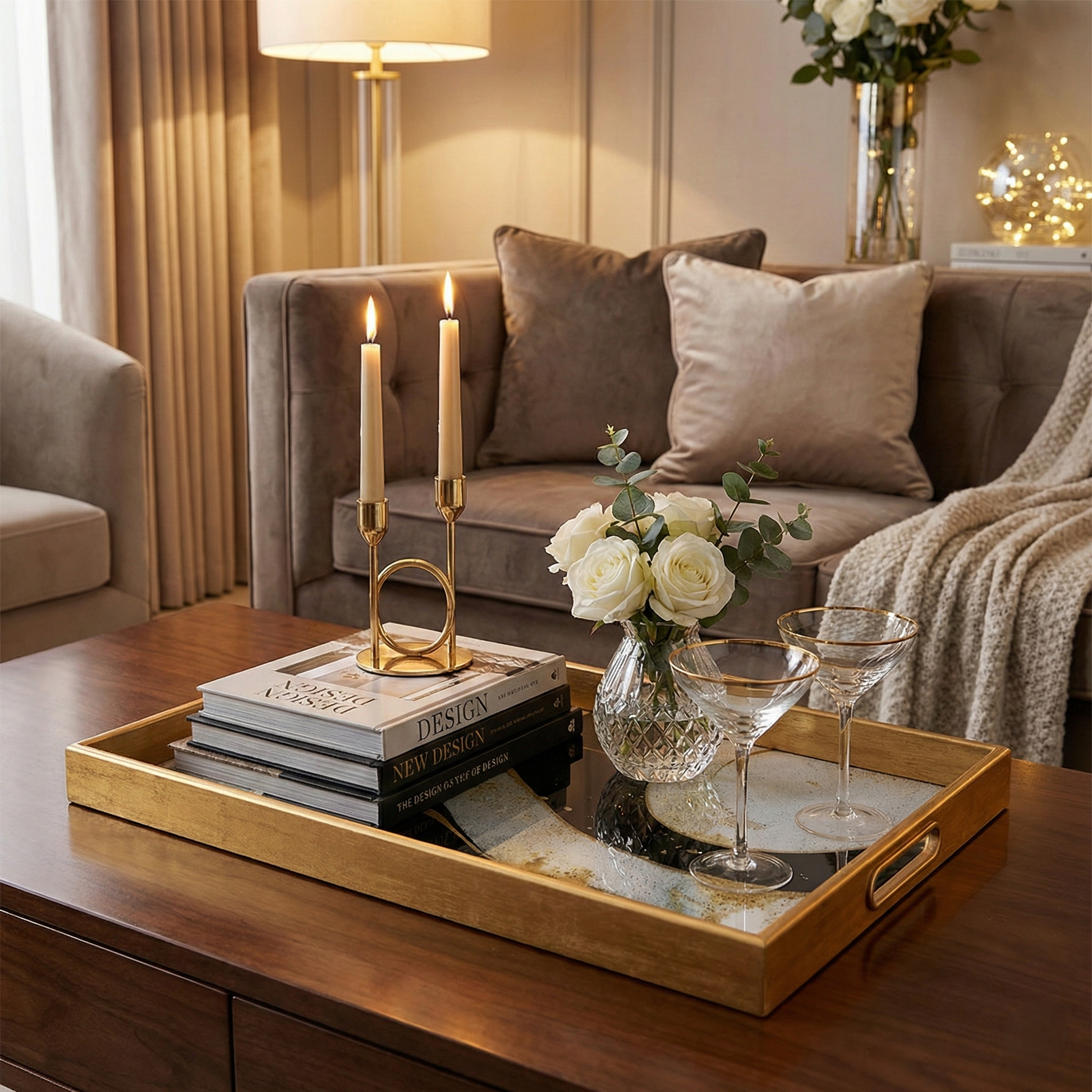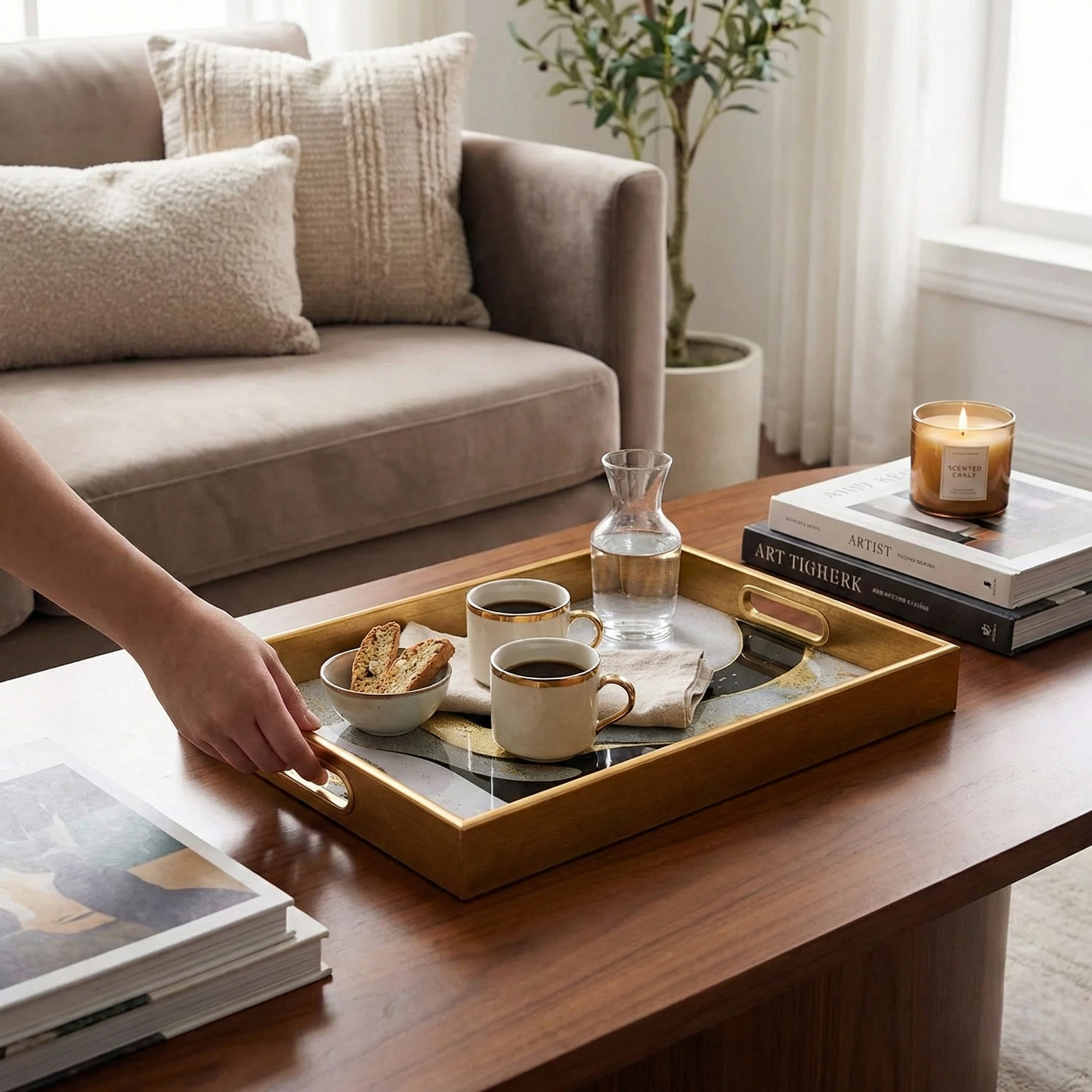 Ce qui rend ce plateau si exceptionnel, c'est l'équilibre parfait entre esthétique et praticité. Sa structure robuste, son incrustation en verre et ses poignées intégrées facilitent son déplacement, tandis que son design lui confère une allure toujours élégante et raffinée. Que vous l'utilisiez au quotidien ou seulement pour les grandes occasions, cet accessoire vous sera toujours utile.