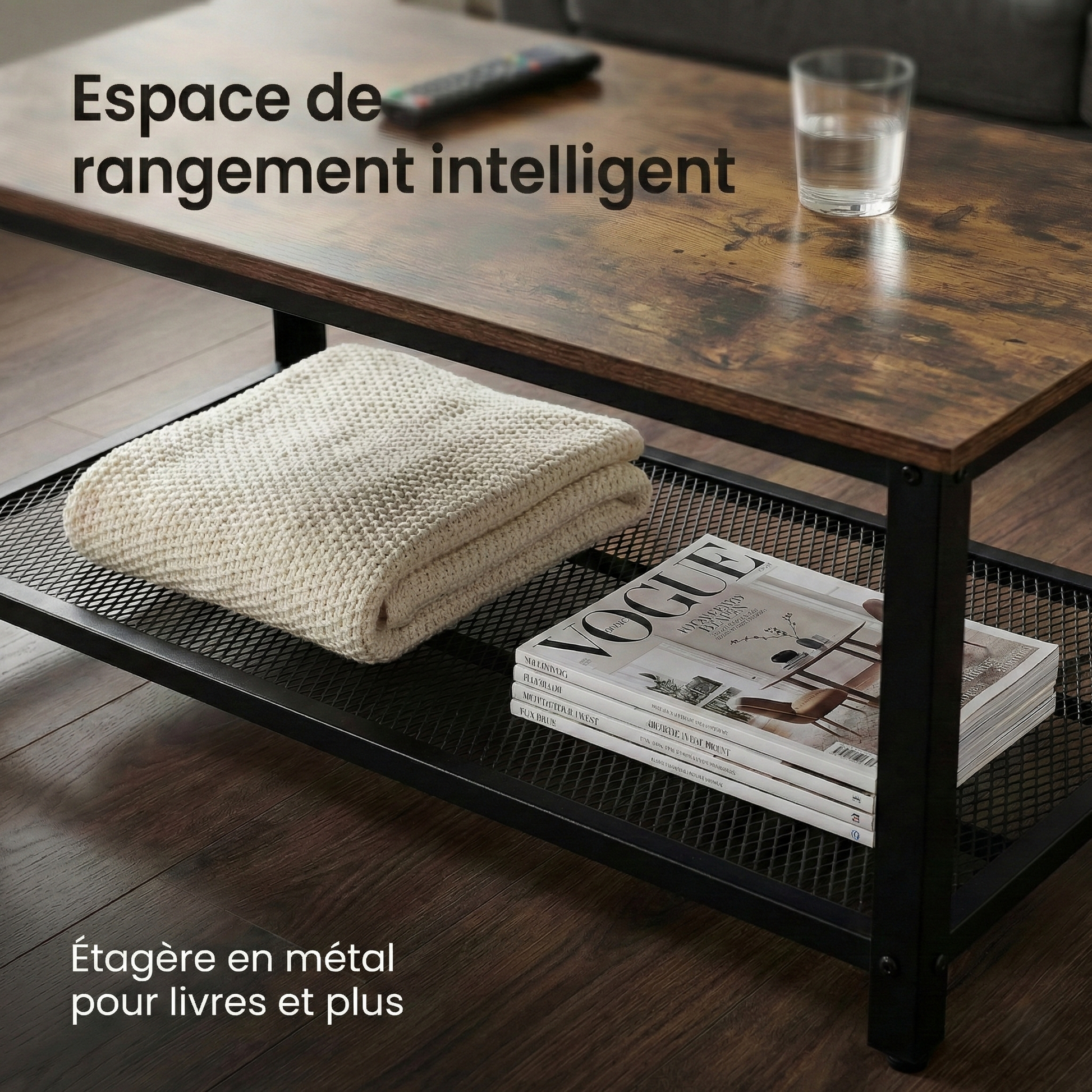 ✅ Rangement astucieux : fini les magazines, les télécommandes et les livres qui traînent ! L’étagère en métal ajouré du bas offre un espace généreux pour un salon propre et bien rangé.